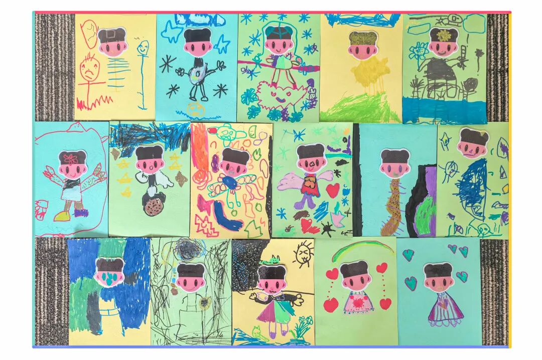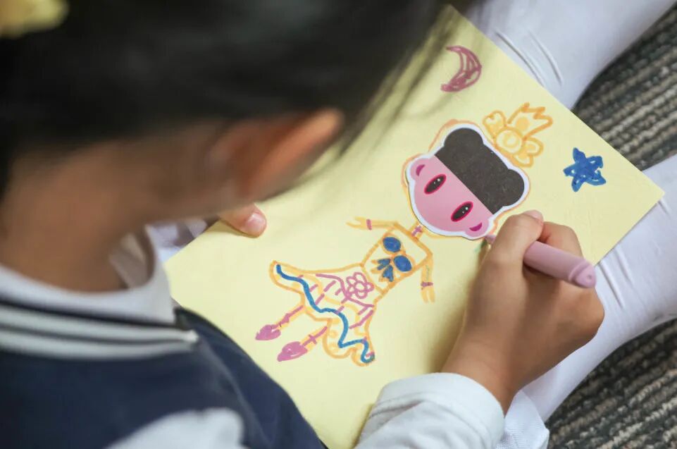 孩子們席地而坐,歡呼雀躍地開始創(chuàng)作,并驕傲地給大家分享自己的“熊貓人”故事。